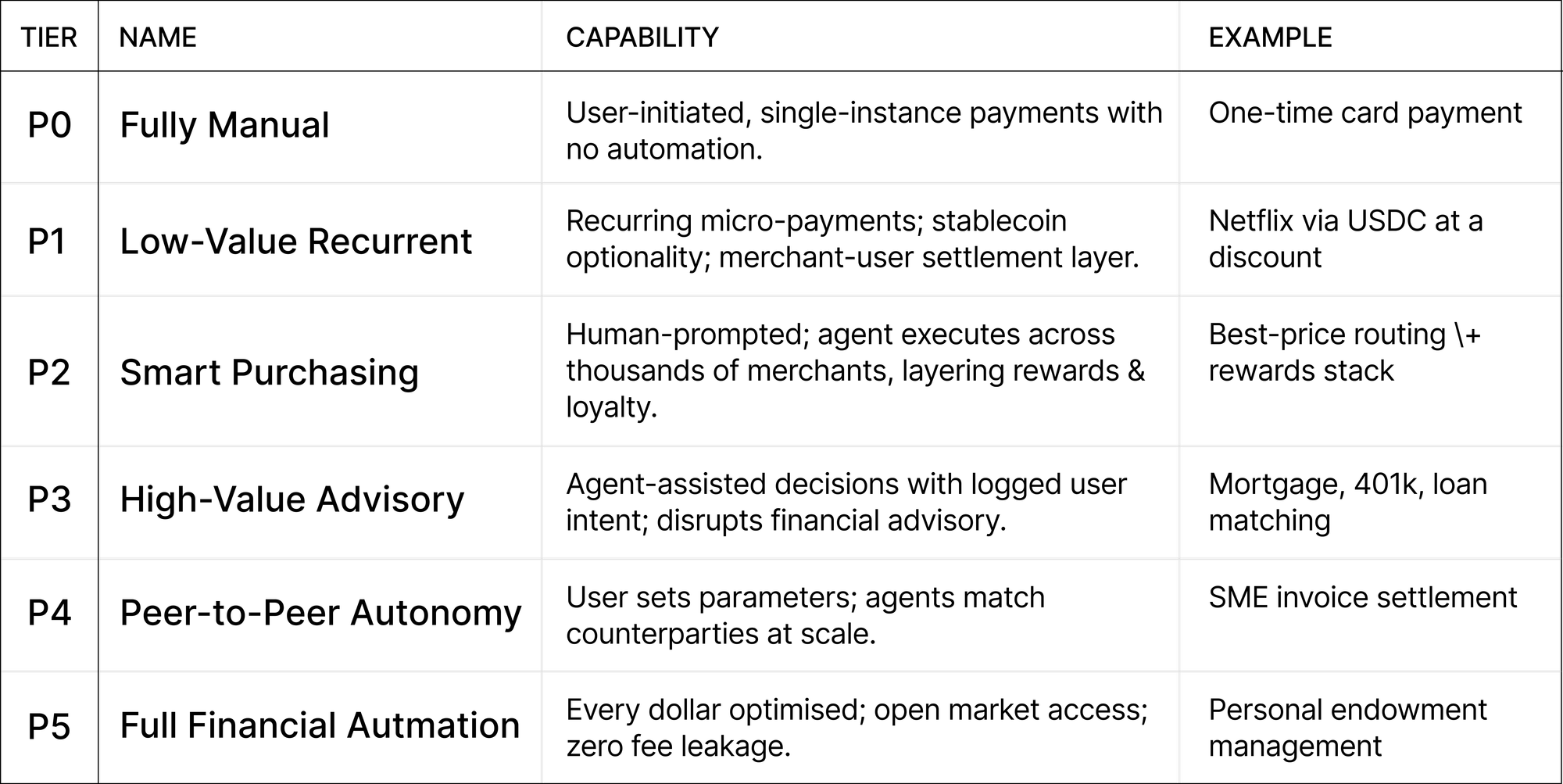 P4 - Peer-to-Peer Autonomy. Agent-to-agent marketplaces. P4 introduces a qualitative shift: rather than executing against a fixed menu of merchant or institutional counterparties, the agent becomes a participant in a dynamic, agent-to-agent marketplace. The user establishes parameters - price limits, counterparty quality thresholds, settlement preferences - and the agent seeks matching counterparties autonomously. The SME use case is particularly compelling: a small business owner who today spends 4-6 hours per week on accounts payable and receivable (Intuit QuickBooks SME Survey, 2023) could instead define their treasury objectives and allow their agent to optimise continuously. This is not science fiction - it is a direct extension of the algorithmic market-making infrastructure that has operated in institutional equity markets for over two decades.